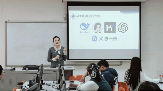 周文惠老师随后分享了关于论文辅助协作的内容。她详细介绍了如何利用DeepSeek结合豆包、秘塔AIKimi等软件进行论文的题目创作、摘要撰写、中英文翻译以及降重润色等工作。周老师的分享让参会者对AI在学术写作中的应用有了更深入的了解。